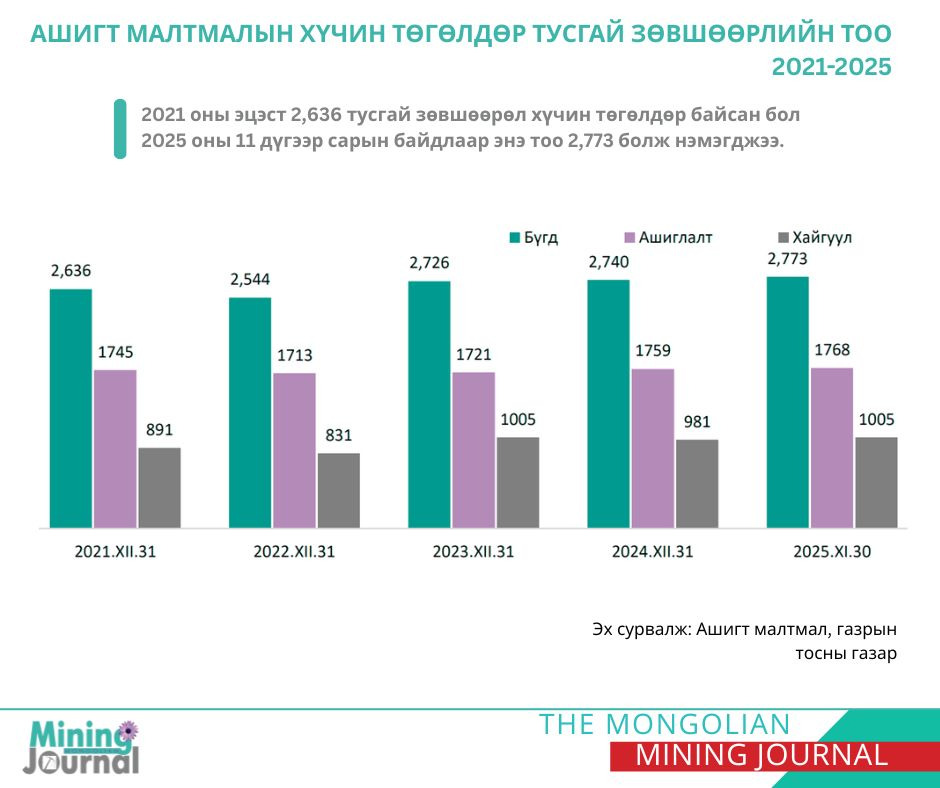 Монгол Улсад олгогдсон ашигт малтмалын тусгай зөвшөөрлийн тоо болон хамрах талбайн хэмжээ 2021–2025 оны хооронд ерөнхийдөө тогтвортой өсөх хандлагатай байгааг Ашигт малтмал, газрын тосны газраас гаргасан сар бүрийн тайлан мэдээ харуулж буй.