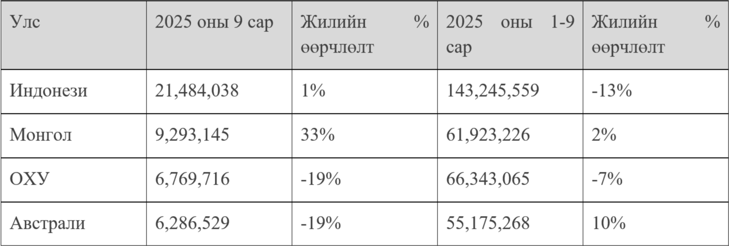 Өнгөрсөн есдүгээр сард Монгол Улс Хятад руу 9.29 сая тонн нүүрс тээвэрлэсэн талаар БНХАУ-ын Гаалийн ерөнхий газраас мэдээллээ. Энэ нь жилийн өмнөхөөс 33%-иар өссөн үзүүлэлт юм.