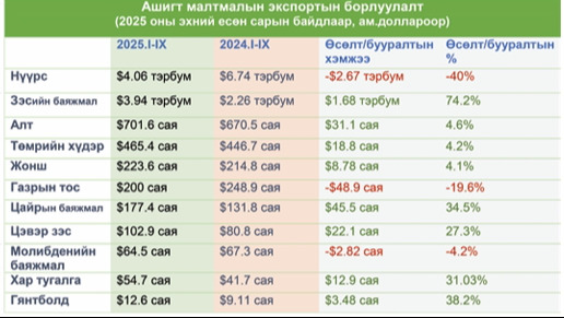 Зэсийн баяжмал, нүүрс, алтны экспорт энэ хугацаанд улсын нийт экспортын 80%- ийг бүрдүүлжээ.