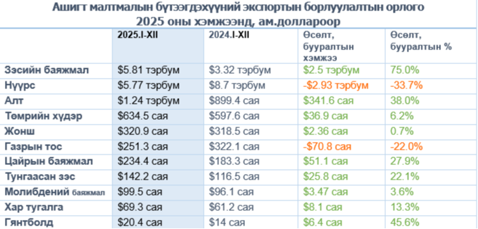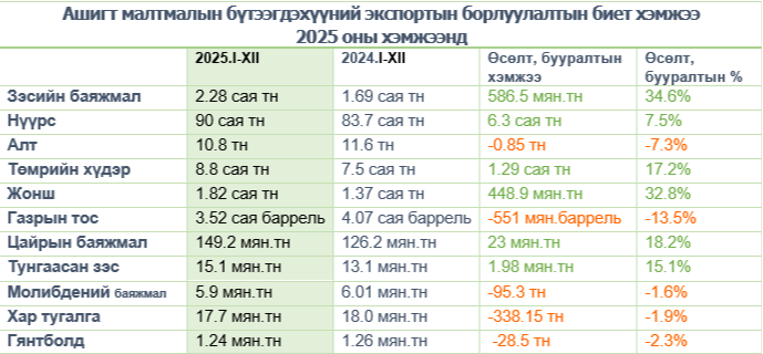 2025 оны эцсийн дүнгээр улсын нийт экспортын 81.5%-ийг нүүрс, зэсийн баяжмал, алт, төмрийн хүдрийн борлуулалт эзэллээ.