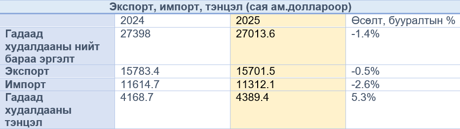 Үндэсний статистикийн хорооноос 2025 оны гадаад худалдааны үзүүлэлтүүдийг (2026.01.12) танилцууллаа. Өнгөрсөн онд манай улс нийтдээ 163 улстай худалдаа хийж, үүнээс экспорт 15.7 тэрбум ам.доллар, импорт 11.3 тэрбум ам.доллар болж, тэнцэл 4.4 тэрбум ам.долларын ашигтай гарлаа.