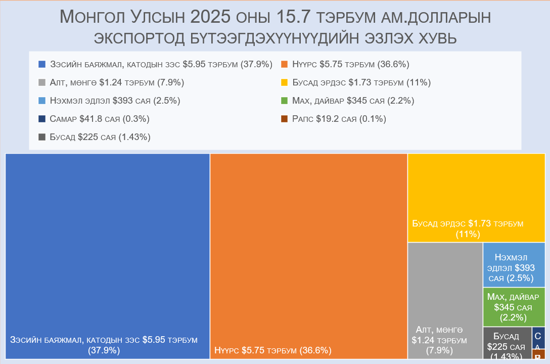 Экспортыг дотор нь ангилж үзвэл нэхмэл эдлэл, мах, дайвар бүтээгдэхүүн, самар, рапсын экспорт нийлээд 2025 онд 800 сая ам.долларт хүрсэн нь улсын нийт экспортын 5%-ийг бүрдүүлж байна. Өнгөрсөн онд уул уурхайн бүтээгдэхүүний экспорт үндсэндээ 14.7 тэрбум ам.доллароор хэмжигдсэн бөгөөд үүнээс харахад манай улсын уул уурхайн бус бүтээгдэхүүний экспорт 1 тэрбум ам.доллароор илэрхийлэгджээ. Энэ нь 2024 оны түвшинтэй ойролцоо буюу ялимгүй өссөн дүнтэй байна.