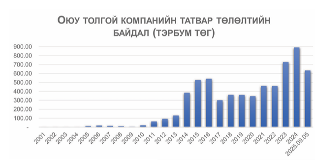 Сонсголоор сонирхол татсан татвар төлөлтийн талаарх нарийвчилсан мэдээллийг Татварын ерөнхий газрын Том татвар төлөгчийн газрын дарга С.Төгсжаргал өгсөн. Тус компани 2002 оноос эхлэн энэ оны 9 дүгээр сарын 5-ны байдлаар нийтдээ 6.4 их наяд төгрөгийн татвар, төлбөр, хураамжийг төвлөрүүлсэн тухай танилцуулсан. Үүнд 18 төрлийн татвар, хураамж, төлбөр багтаж байгаа юм. Компанийн албан татвар ногдуулалт, төлөлтийн байдалд 6 удаагийн хяналт шалгалт ТЕГ-аас хийсэн байна. Ингээд хяналт шалгалтын төлбөрөөр 2021 болон 2024 онд нийт 1.3 их наяд төгрөгийг төлжээ. 2002 оноос хойш 2025 оны III дугаар улирлын байдлаар "Оюу толгой" компани нийт 62.9 их наяд төгрөгийн зардал гаргасан тухай мөн Татварын ерөнхий газар мэдээллээ.