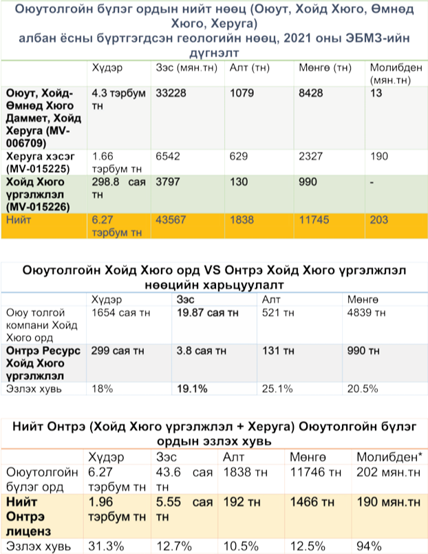 Энэ талбайд тус компани "Оюу толгой" компанитай ашиг хуваах гэрээтэй. Ялангуяа ирээдүйд ашиглагдах зэсийн асар том нөөц бүхий Херуга ордын тухайд Оюутолгойн бүлэг ордын молибденийн нөөцийг бараг бүхэлд нь агуулж буй юм. "Онтре"-ийн асуудлаар Засгийн газар ухаалаг хэлэлцээр хийж чадвал манай улсад ихээхэн ашигтай шийдвэр гарах боломжтой. Гэхдээ хугацаа алдаж болохгүй. Учир нь одоо яригдаж буй гол асуудал болох Хойд Хюго үргэлжлэл дээр далд уурхайн олборлолтын үйл явц өрнөхөөр байгаа тул хэлэлцээрийг хурдавчлах шаардлага үүсээд буй. "Онтре"-тэй манай улс шинэ Хөрөнгө оруулалтын гэрээ тусад нь байгуулан, төрийн эзэмшлийн хувийг тогтоож, АМНАТөлбөрийг тогтворжуулаагүй хэлбэрээр хийх төлөвтэй байна.
