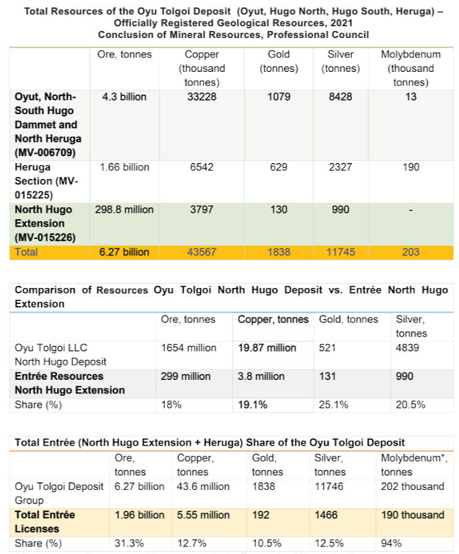 *“(In some studies reported internationally by Turquoise Hill, molybdenum resources are noted as 413 436 thousand tonnes, while in Entrée’s licensed areas, the estimated potential molybdenum resources are 390 thousand tonnes.)”