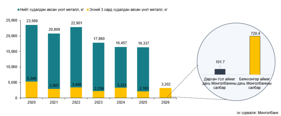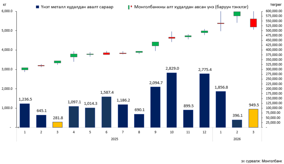 Монголбанк 2026 оны 3 дугаар сард 949.5 кг, оны эхнээс өссөн дүнгээр нийт 3.2 тонн үнэт металл худалдан авлаа. Үүнээс Дархан-Уул аймаг дахь Монголбанкны салбар 101.7 кг, Баянхонгор аймаг дахь Монголбанкны салбар 720.4 кг үнэт металл тус тус худалдан авсан байна. Үнэт металлын нийт худалдан авалт өмнөх оны мөн үетэй харьцуулбал 48%-иар өссөн дүнтэй байна.